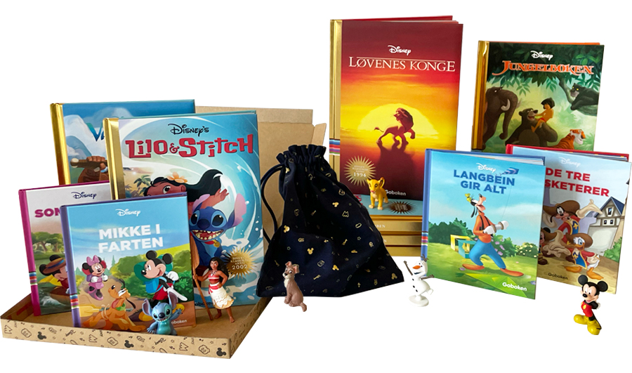 Hver bokpakke inneholder en stor og detaljert bok med en klassisk eller ny Disney-historie, en mindre bok fra Andeby-universet eller fra Lær om livet-serien, samt en kul Disney-figur knyttet til bøkene. Du får også tilgang til lydbok og ebok i Goboken-appen.